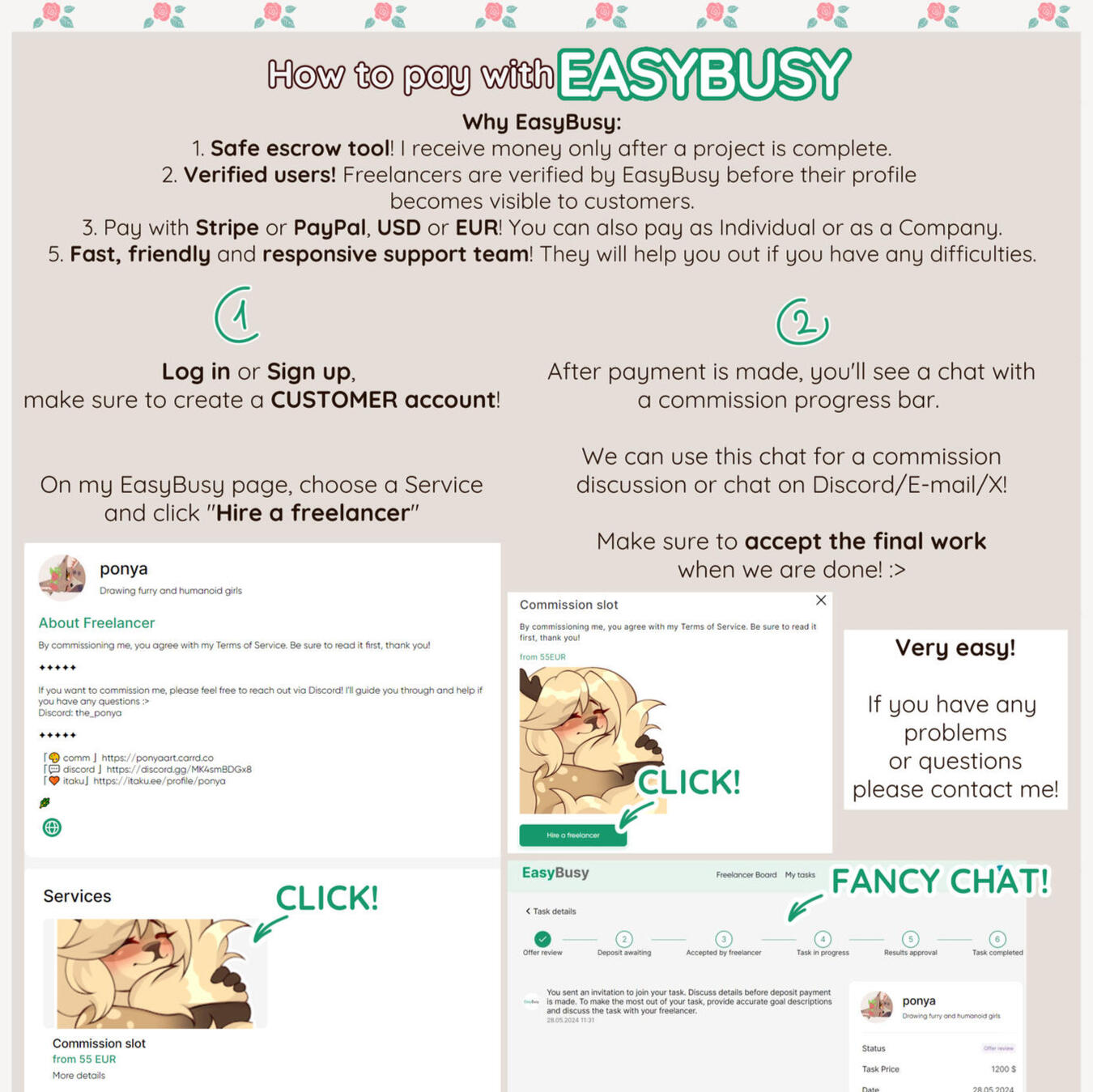 Payment is made after the sketch approval via EasyBusy USD/EUR (via PayPal or Card)